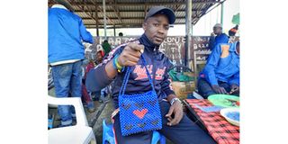 James Karanja Displays a handbag made from beads. The bag goes for Sh 500