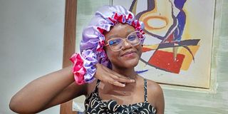 Gladwell Akoth Abilah poses for a photo wearing a bonnet and scrunchies she sells on 1 December 2025