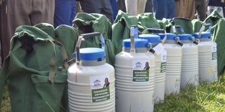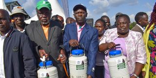 Farmers in Kuresoi south display the AI kits received from the county administration.