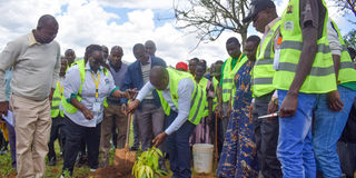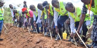 Residents from Visoi Ward plant Napier Grass on the demonstration site on fro the retention ditches