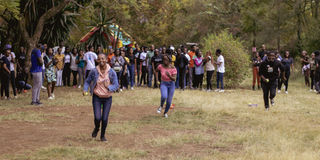 Participants at Kujikubali forum held at Hyrax hill take photos before the event.