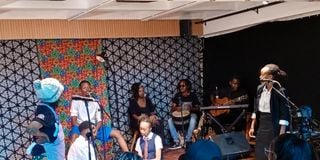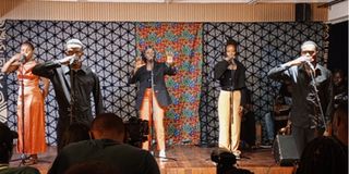 (From Right) Poets Timelines, Belvin, Nyash, Nitap and Scar performing the Clarion call set on 25th October 2025 at Baraza Media Lab.