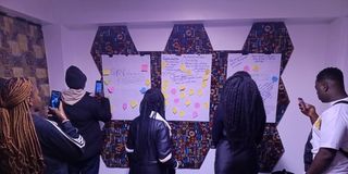 Attendees read the sticky notes in the rage room during the Lust Cargo showcase on 25th October 2025 at Baraza Media Lab.