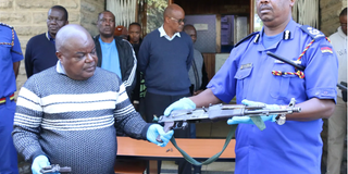 Nakuru County Commissioner Loyford Kibaara (left) and Former Nakuru County Police Commander Michael Mwaura, display the gun recovered in Bondeni area on June1,2025