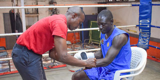 Wesley Kennedy Adede's coach fits his boxing gloves before training at Nakuru boxing club on 19th September, 2025.