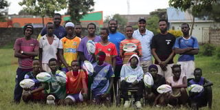 From left Back row, Menengai oilers Head coach Gibson Weru and Teddy Omondi, Rugby Regional Development Officer in Paris in the company of Menengai Oilers players as they received ball donations
