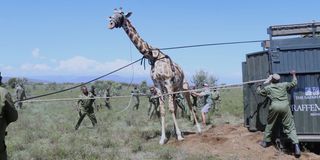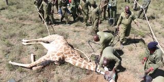 Kenya Wildlife Service rangers restrain a Maasai giraffe at the Kedong Ranch during a large-scale relocation of wildlife due to uncontrolled land use following a change in ownership.