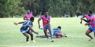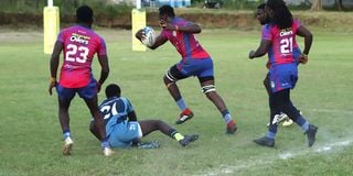 Menengai Oilers player Philip Okeyo makes a ball carry in their Kenya Cup match day 1 against Daystar Falcons held Refinery grounds in Nakuru on November 22,2025