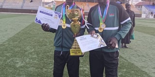 Coach Camlus Juma (L) and Wesley Kennedy Adede pose for a photo after winning the Kenya Adaptive Paraboxing Federation (KAPBF) Tournament in Nairobi on December 12 2025