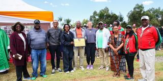 Faith Kipyegon posefor a photo with friends and Athletic Kenya officials during the launch of Dare to Dream maternity hospital at her home in Keringet.