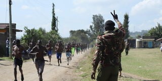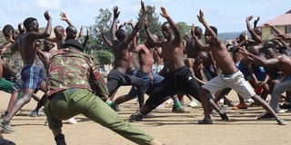A group of men engaged in a cool down session after their run during the Kenya National Police recruitment process at Kapkures on November 17,2025.