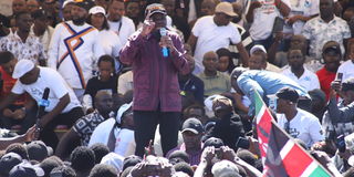Siaya Governor James Orengo, addressing supporters at the Linda Mwananchi rally at Mazembe Grounds in Nakuru