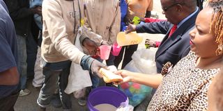 Former NACADA chairman and legistalor John Mututho and Nancy Ndegwa, founder of Realz Hands of Love feed street families during the International Day for Street Children celebrations