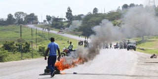A protester walks past a bonfire lit along Nakuru-Kabarak road during protests on June 10,2025.
