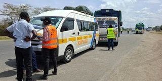 NTSA officers conduct a compliance check on vehicles plying the Nairobi-Nakuru-Eldoret highway on December 4 at Salgaa area