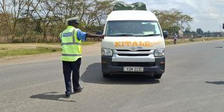 Police stops and directs a PSV shuttle and lorry for compliance checks by NTSA at Salgaa on December 4